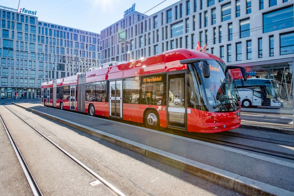 Les nouveaux trolleybus de HESS du type lighTram® 25 DC augmentent la capacité du transport public à Berne, la capitale de la Suisse.